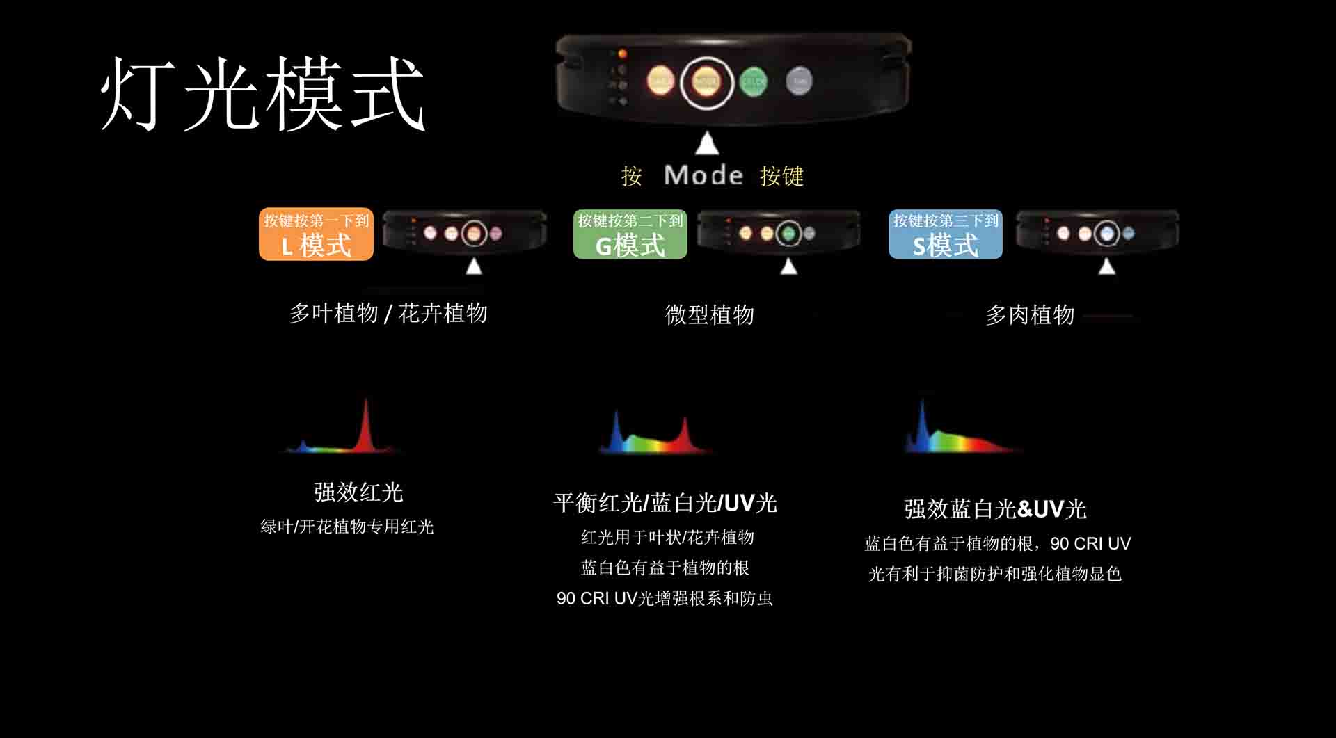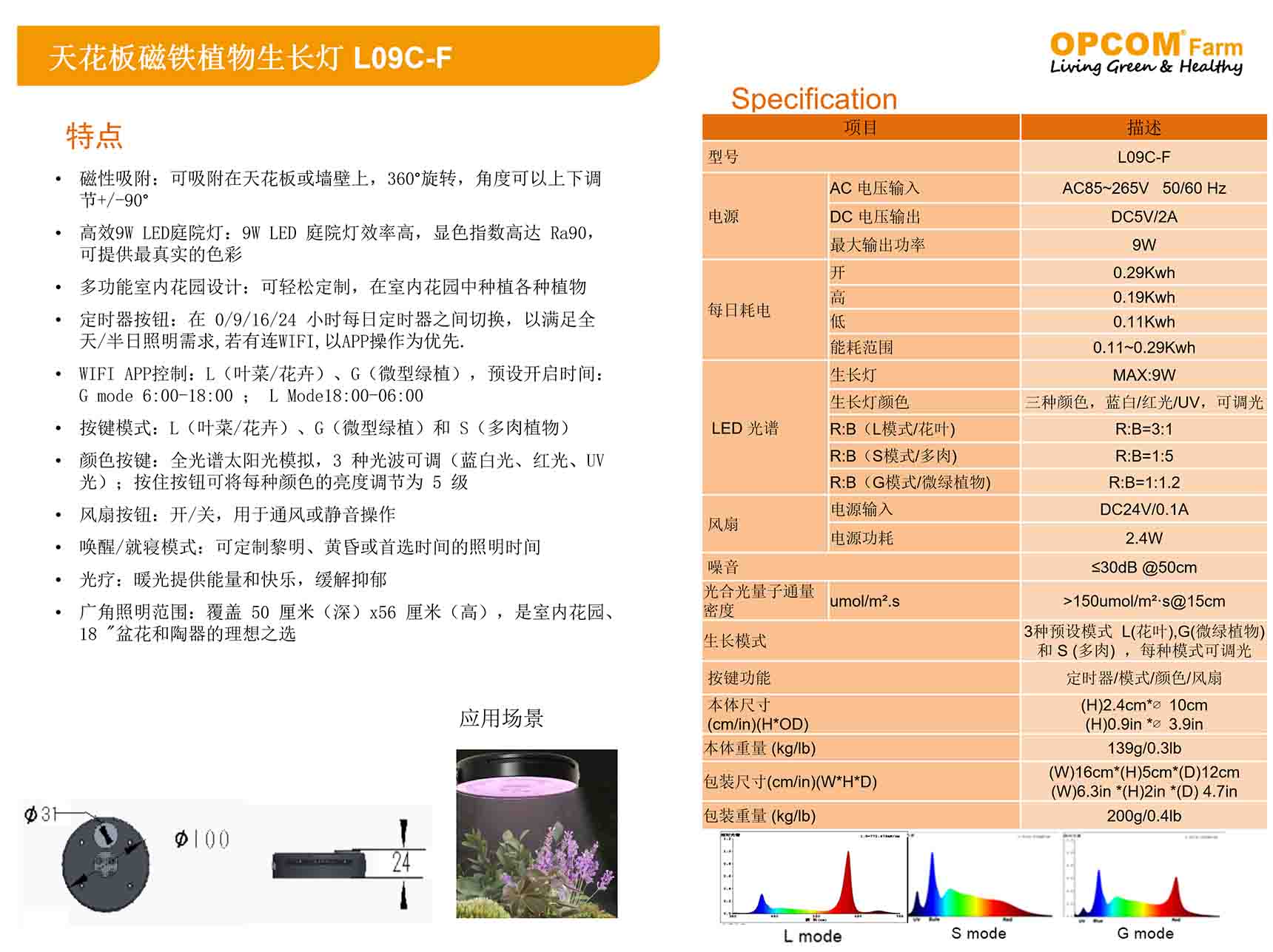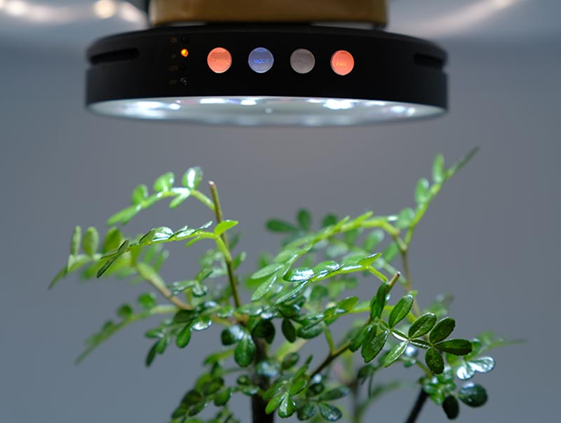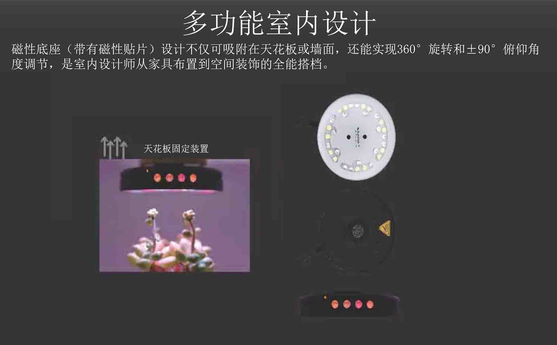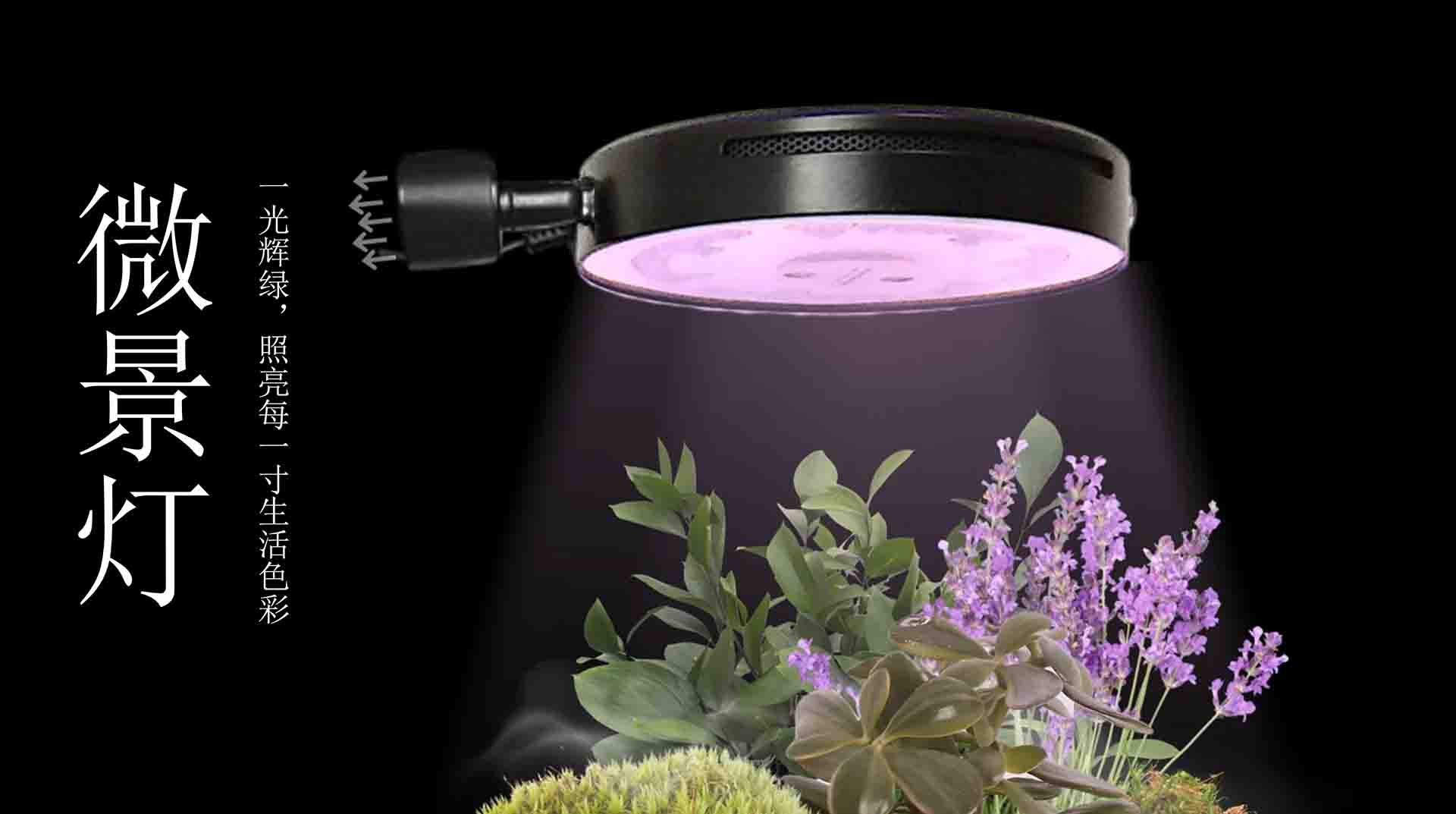 高效率 9W LED 微景灯,可吸附天花板或墙侧,360˚旋转,显色性高达 Ra90,具定时、模式和颜色切换键,满足各类植物需求。内置风扇与唤醒/睡眠设置,可选配竹制底座搭配室内设计。
