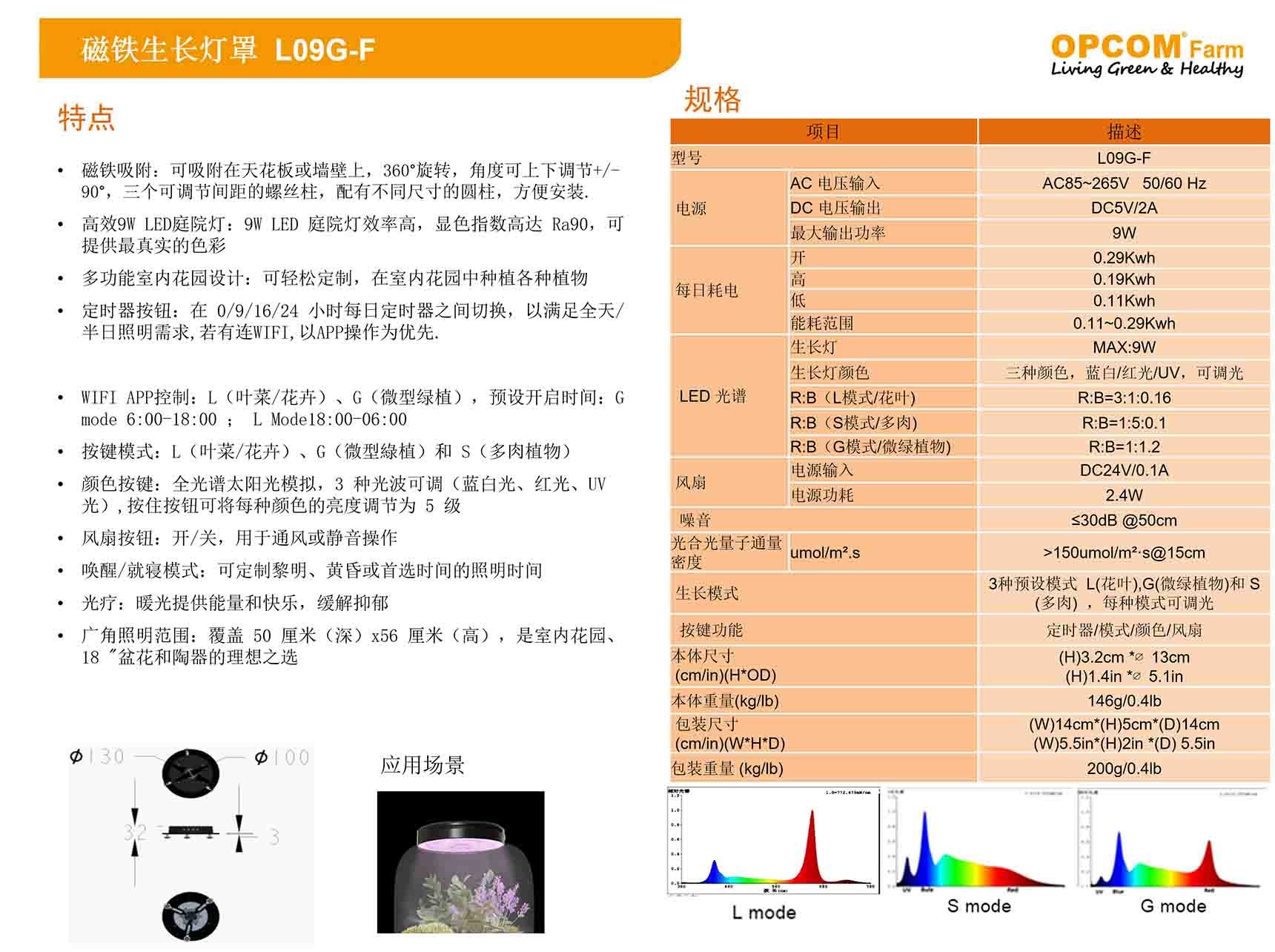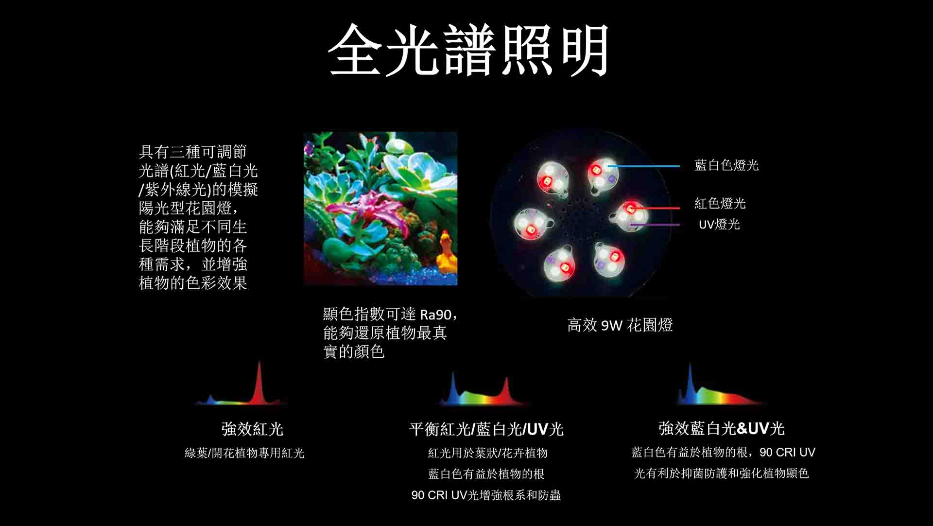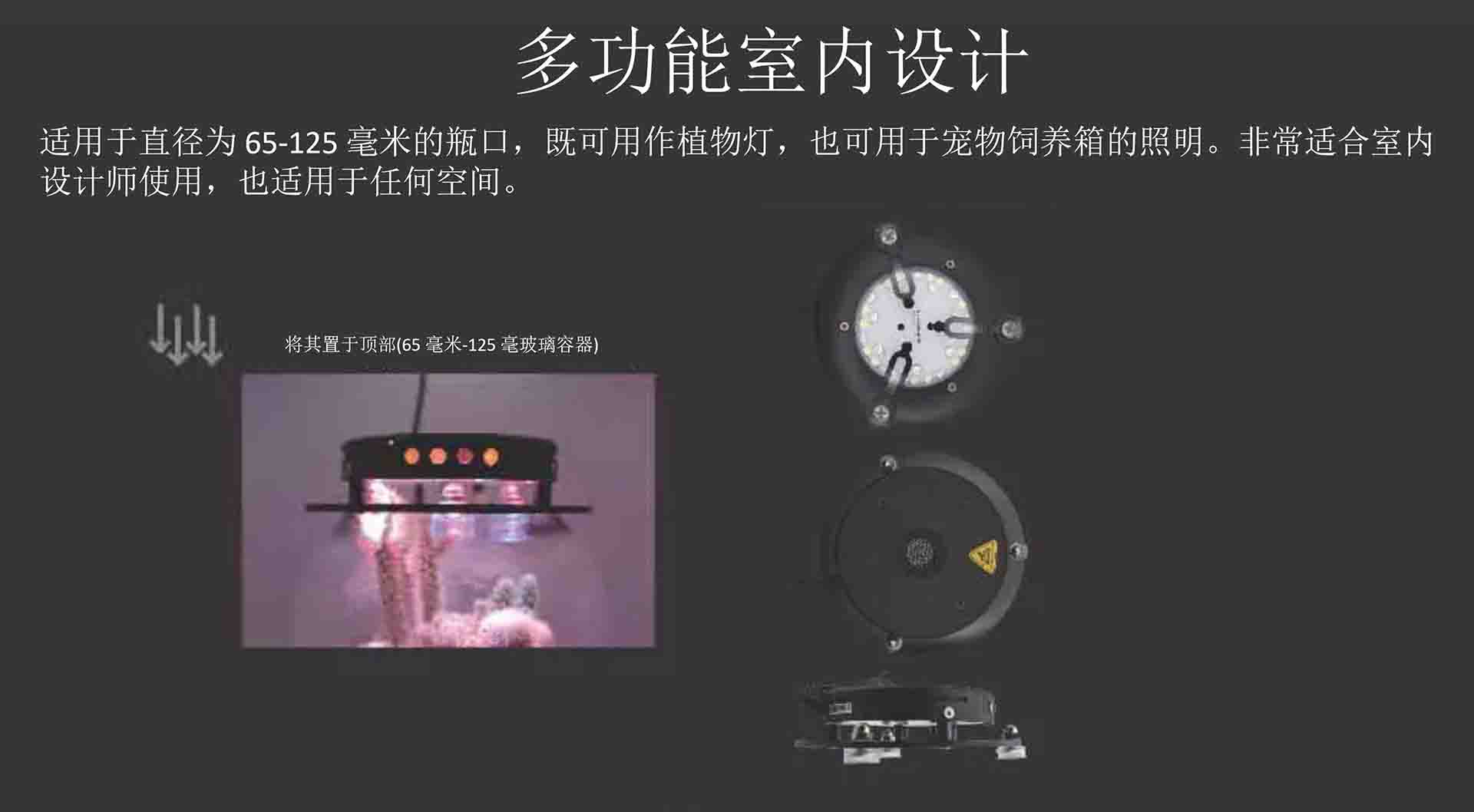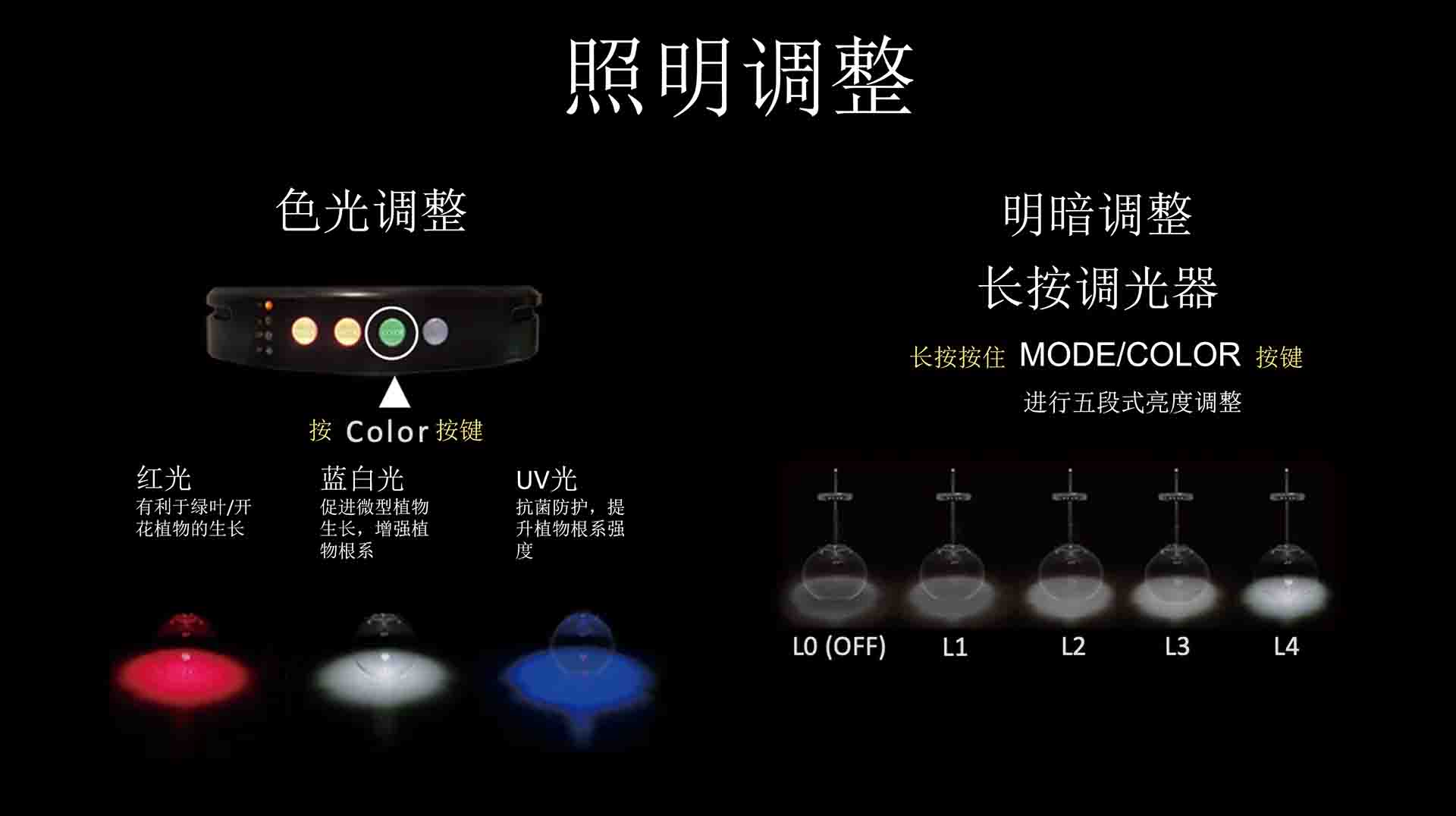 高效率 9W LED 微景灯,可吸附天花板或墙侧,360˚旋转,显色性高达 Ra90,具定时、模式和颜色切换键,满足各类植物需求。内置风扇与唤醒/睡眠设置,可选配竹制底座搭配室内设计。